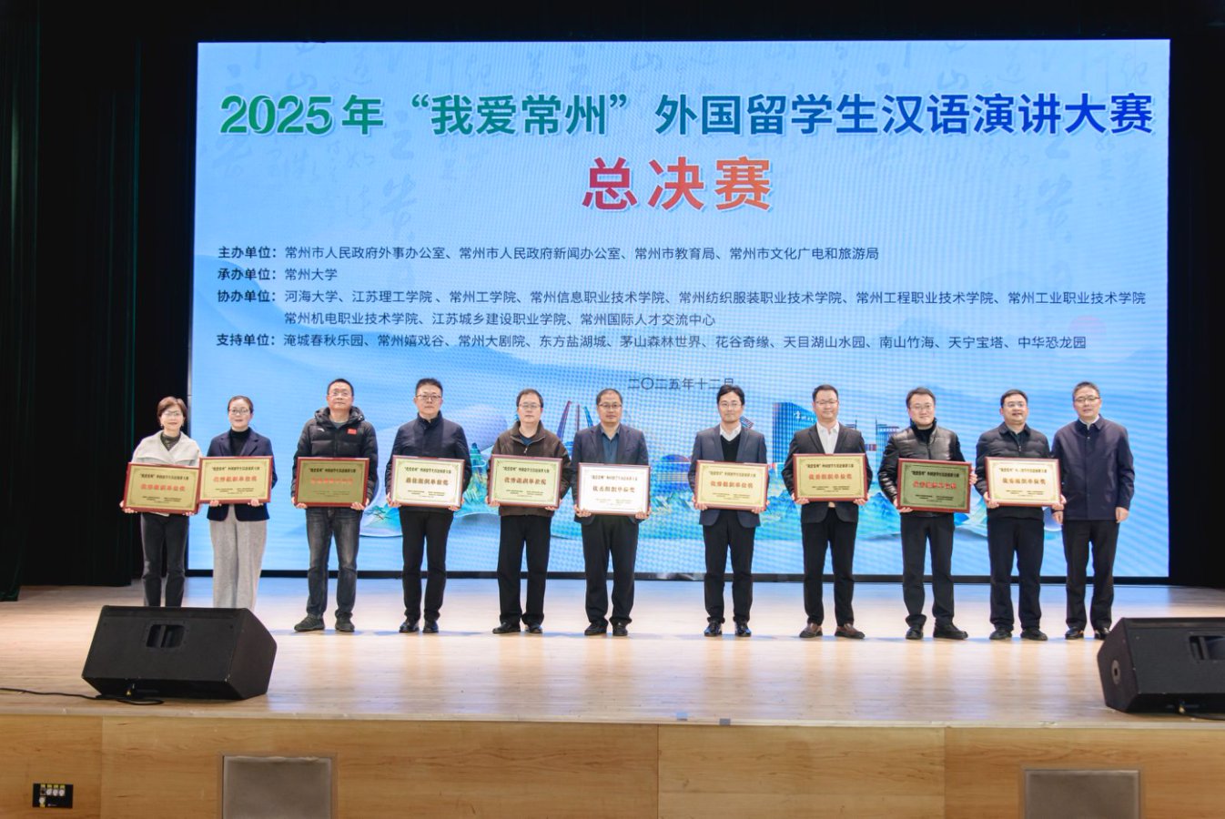 12月18日下午,由常州市人民政府外事办公室、常州市人民政府新闻办公室、常州市教育局、常州市文化广电和旅游局联合主办的2025年“我爱常州”外国留学生汉语演讲大赛总决赛在常州大学西太湖校区举行。我校越南籍留学生武氏金英获二等奖、越南籍留学生阮氏芳草获三等奖,国际教育学院韩瑞获优秀指导教师奖,我校获评“优秀组织单位奖”。